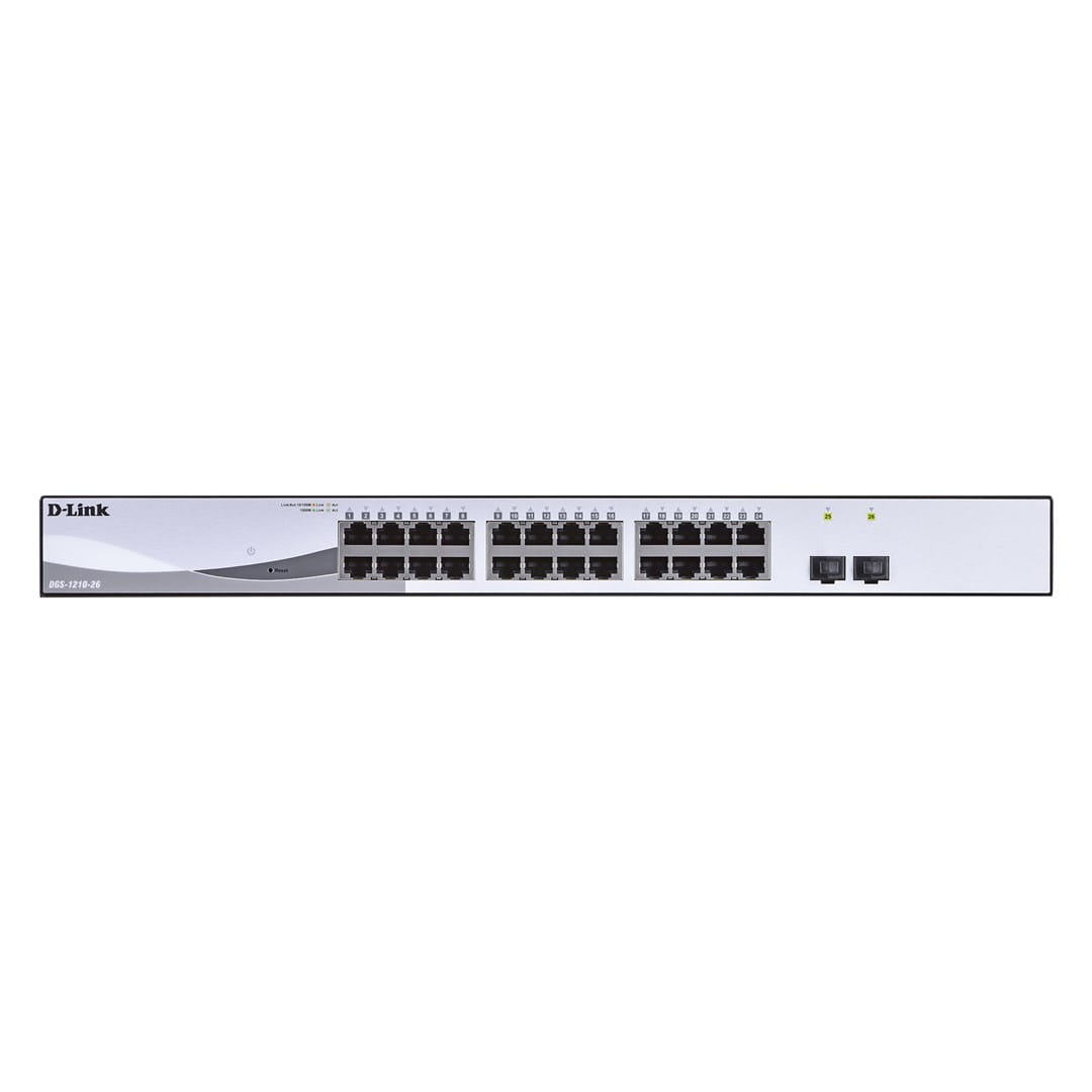 D-LINK DGS-1210-28, Gigabitowy inteligentny przełącznik z 24 portami 10/100/1000Base-T i 4 portami Gigabit MiniGBIC (SFP), 802.3x Flow Control, 802.3ad Link Aggregation, 802.1Q VLAN, 802.1p Priority Queues, Port Mirroring, obsługa Jumbo Frame, 802.1D