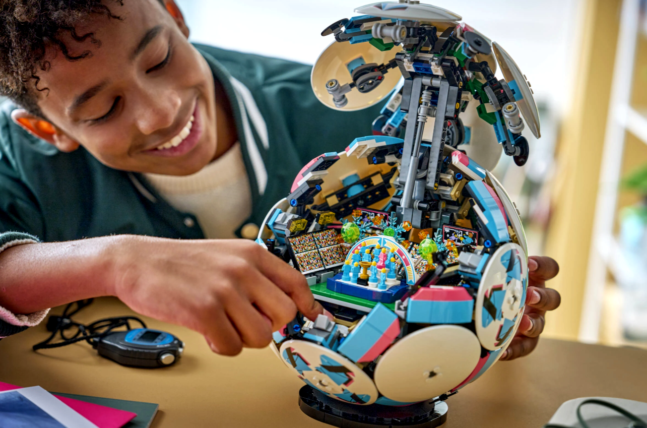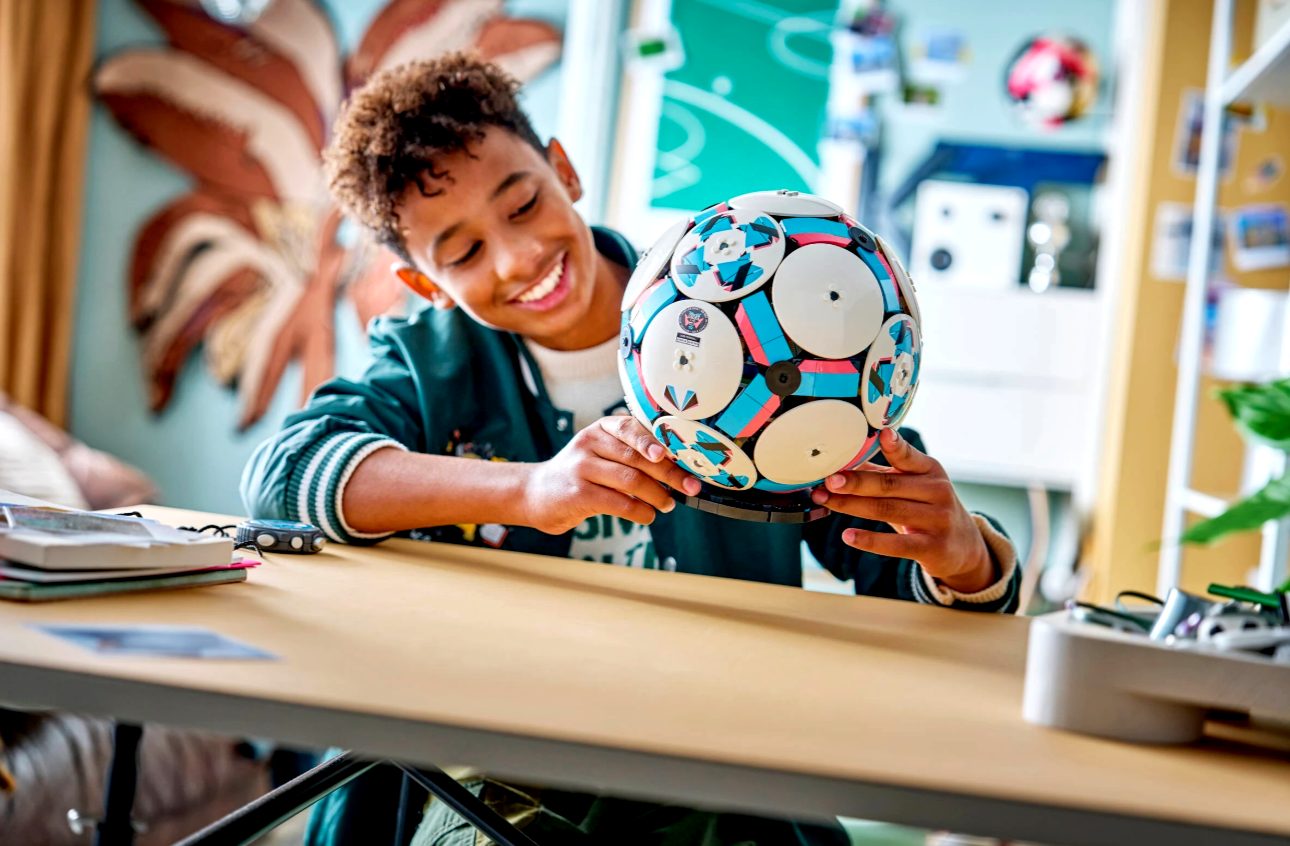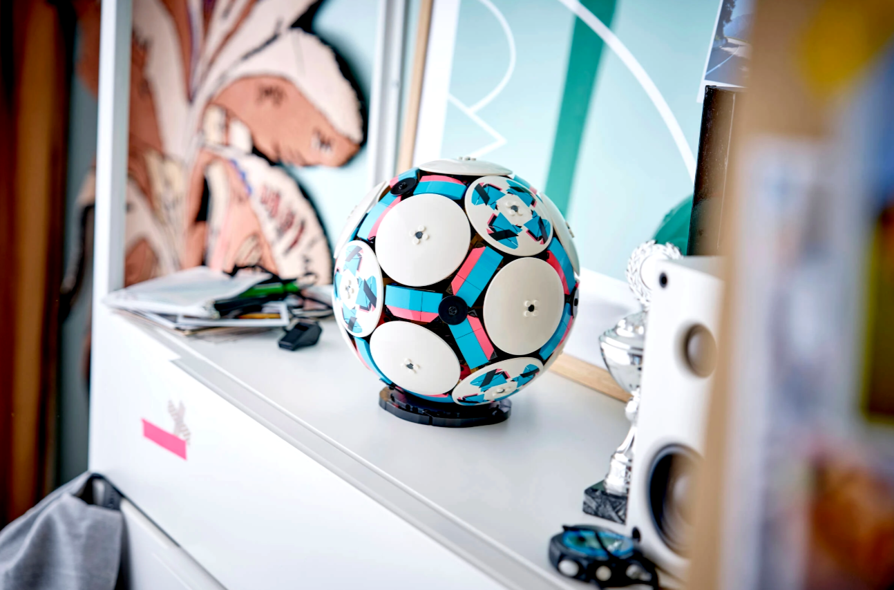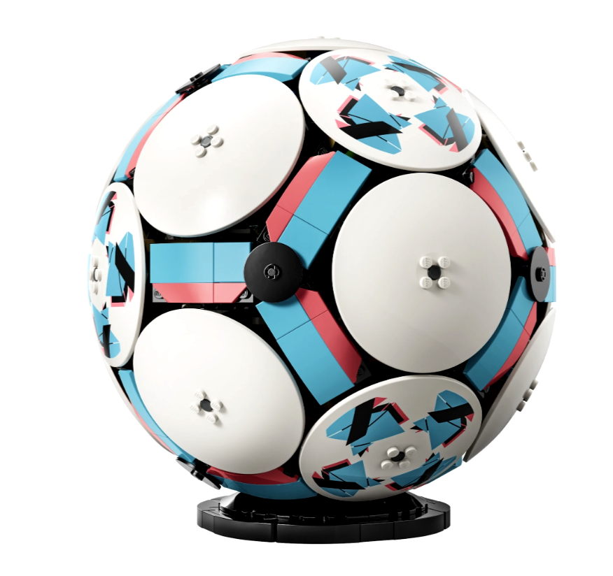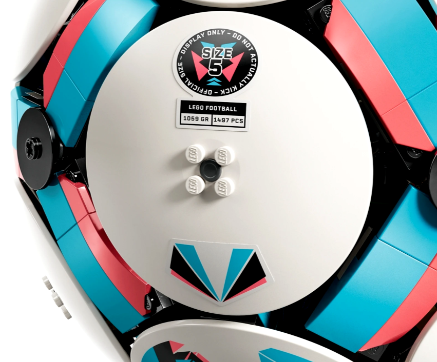 Zestaw kolekcjonerski zawiera elementy LEGO Technic, które pozwalają uzyskać zaokrąglony kształt, a na zewnątrz piłki dodano sześć stylowych, ozdobnych dysków. Natomiast w środku czeka na odkrycie ekscytująca scenka z drużyną celebrującą sukces na małym stadionie. Dzieci mogą nacisnąć przycisk i obejrzeć moment, w którym figurki piłkarzy świętują zwycięstwo, a za sceną wystrzeliwują fajerwerki. Inne ciekawe detale stadionu to mały złoty element w kształcie pucharu pośrodku oraz duże ekrany.