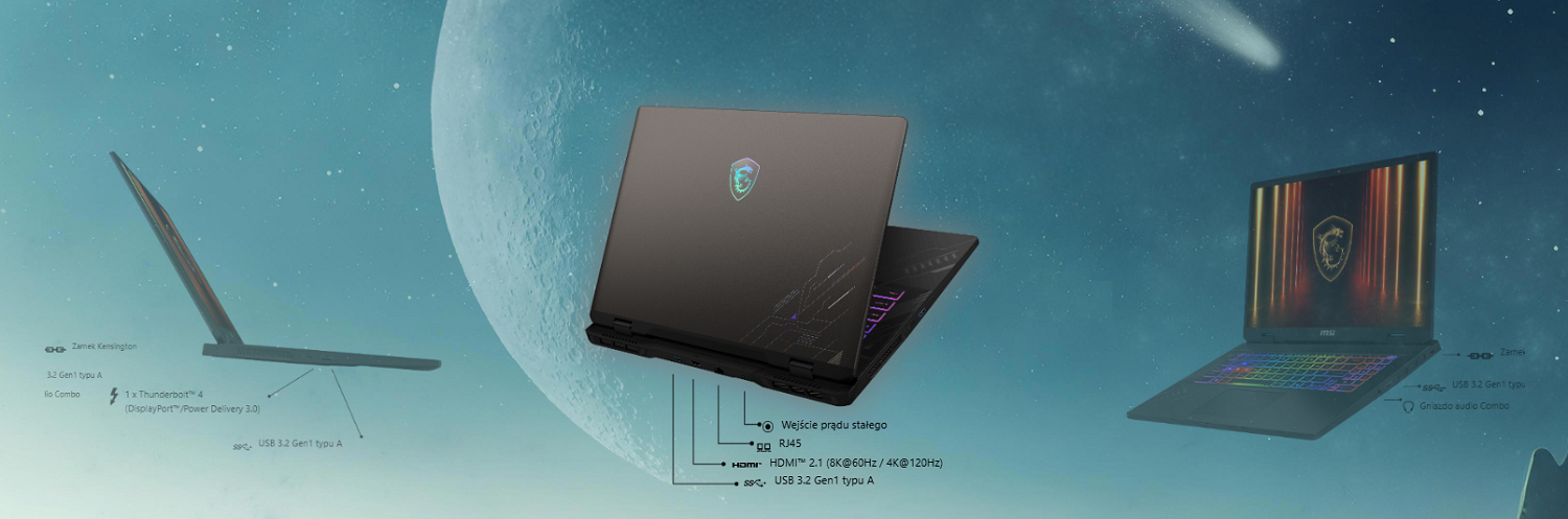 Vector 17 HX AI wyposażony jest w najbardziej kompletny zestaw portów We/Wy, które pozwalają na obsługę wszelkich stosowanych obecnie systemów i standardów transmisji danych lub wyjść sygnału wideo. W ten sposób zapewniono graczom maksymalną elastyczność w wykorzystaniu laptopa.