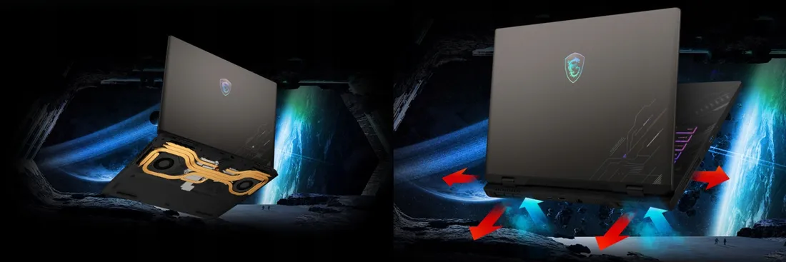 Nowa konstrukcja chłodzenia umożliwia wielokierunkowe wyloty powietrza, co przekłada się na bardziej wydajne chłodzenie. Wraz z konstrukcją współdzielonych rurek z pięcioma rurkami cieplnymi między procesorem a procesorem graficznym, większymi średnicami rurek cieplnych i ekskluzywną pastą termoprzewodzącą MSI możesz mieć pewność maksymalnej wydajności nawet w ekstremalnych warunkach gry.