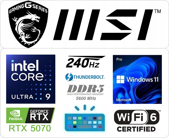 - Karta grafiki: NVIDIA® GeForce RTX 5070 8GB GDDR7 powers advanced AI with 798 AI TOPS Up to 2347MHz Boost Clock 115W Maximum Graphics Power with Dynamic Boost. / Intel® Graphics