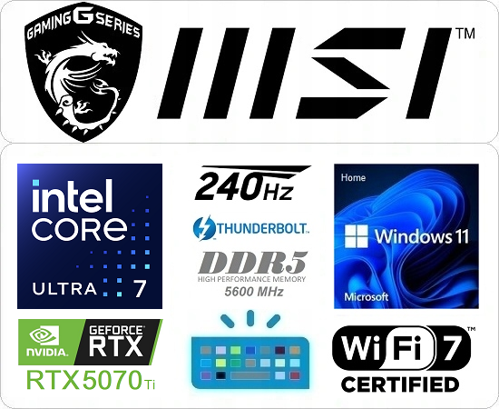 - Komunikacja: Intel® Killer™ Wi-Fi 7 BE1750; Bluetooth 5.4; 2.5 Gigabit Ethernet