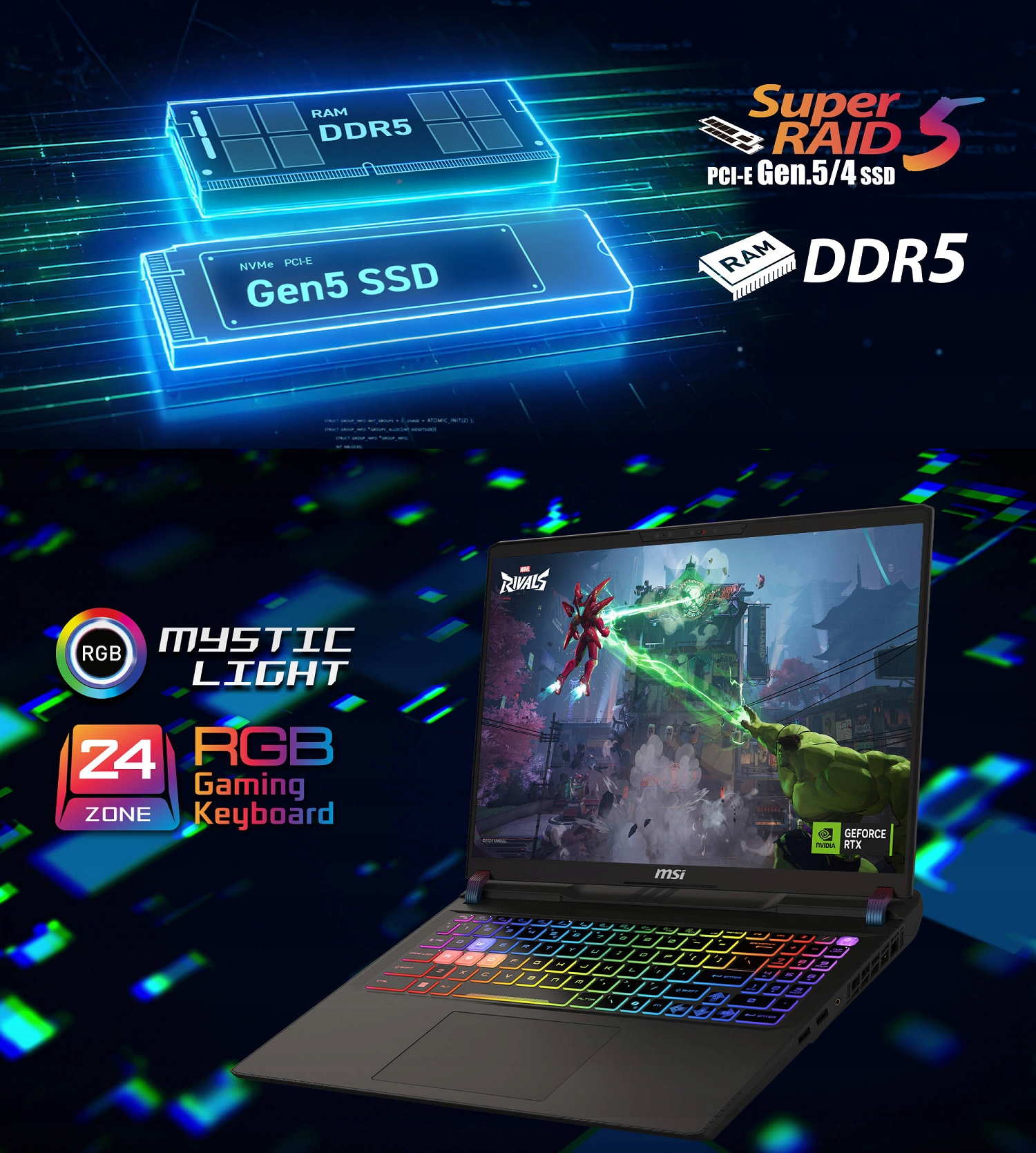Doświadcz promieniujących, żywych świateł 24-strefowej klawiatury RGB z podświetlonymi klawiszami WASD i unikalnie zaprojektowanymi nakładkami na klawisze, które wprowadzą Cię w niezwykłą podróż gamingową z odrobiną stylu!
