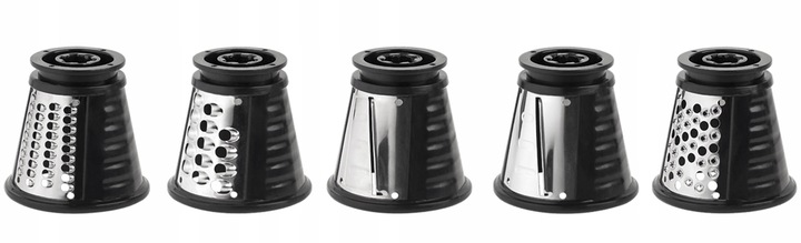• Rodzaje tarek: 4 tarki do krojenia: w cienkie plasterki, w cienkie słupki, w plasterki, w słupki, 1 tarka do przecierania