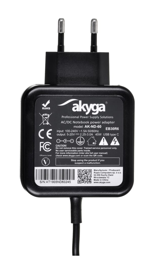 Zasilacz sieciowy Akyga AK-ND-60 do notebooka (20 V; 2,25 A, 2,31 A, 2,37 A, 2,64 A, 3,0 A; 45W; USB Typ C )